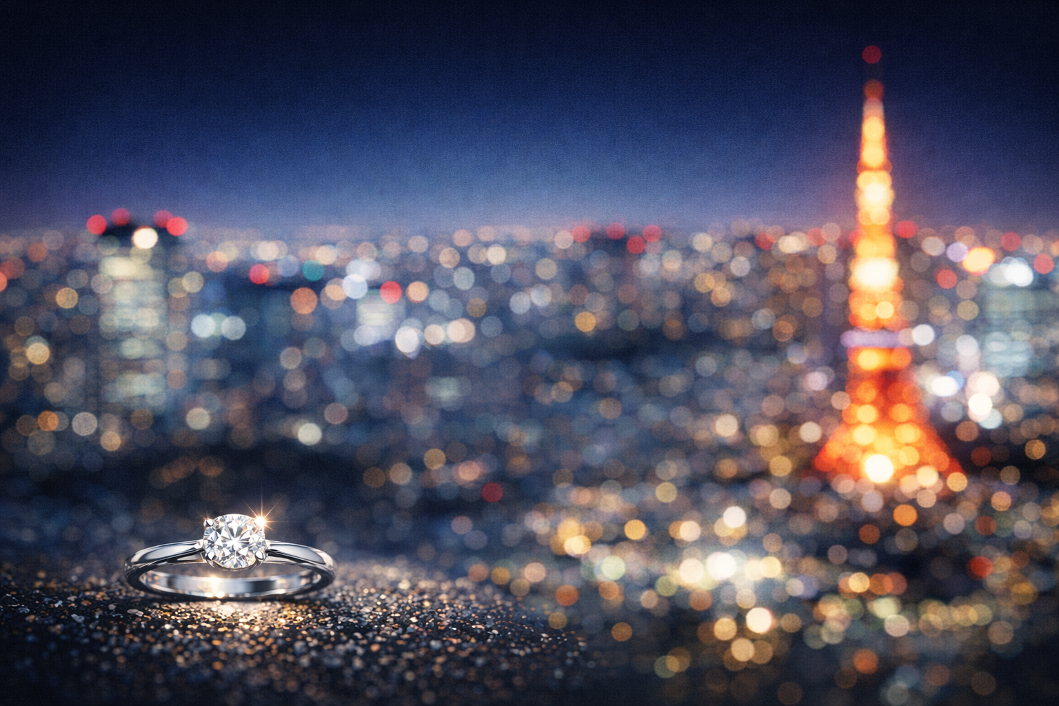 ライトアップされたタワーときらめく都会の景色の中で贈る婚約指輪は、