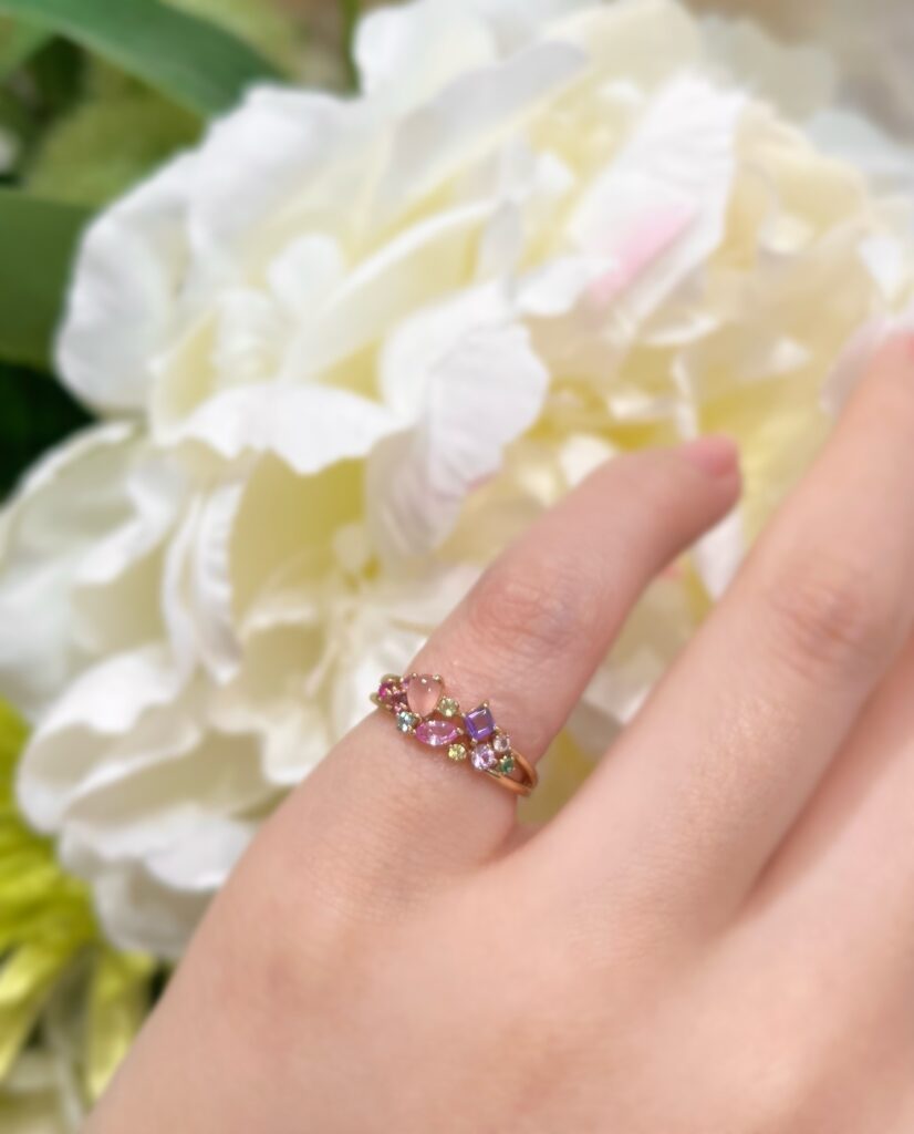 不規則に宝石を並べた華奢なリングは、