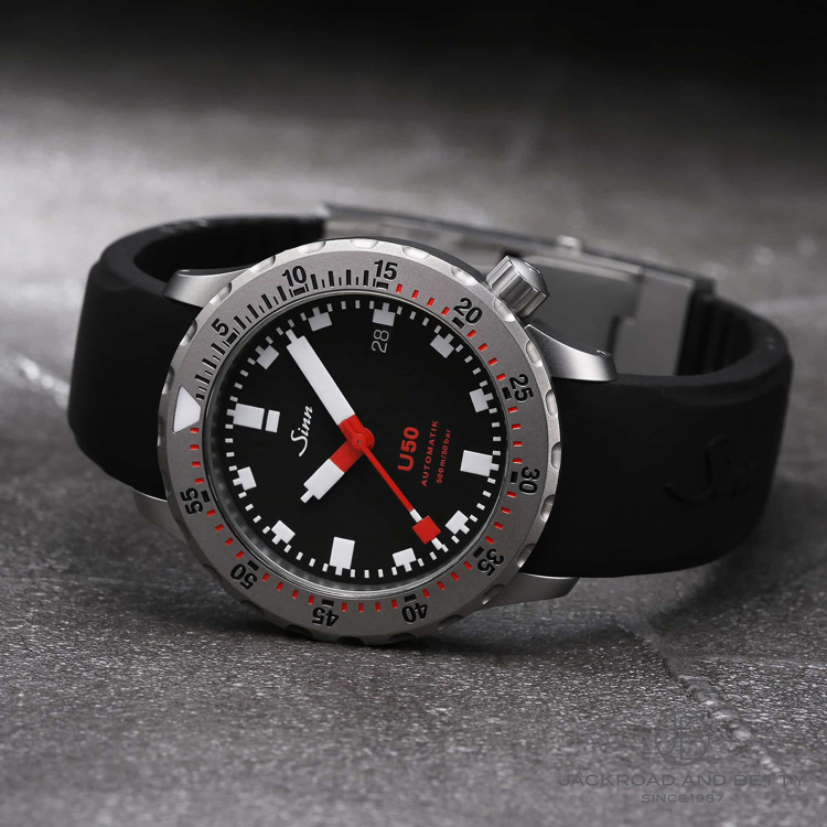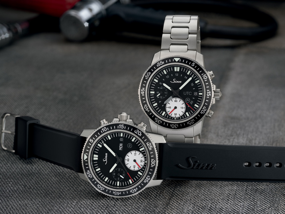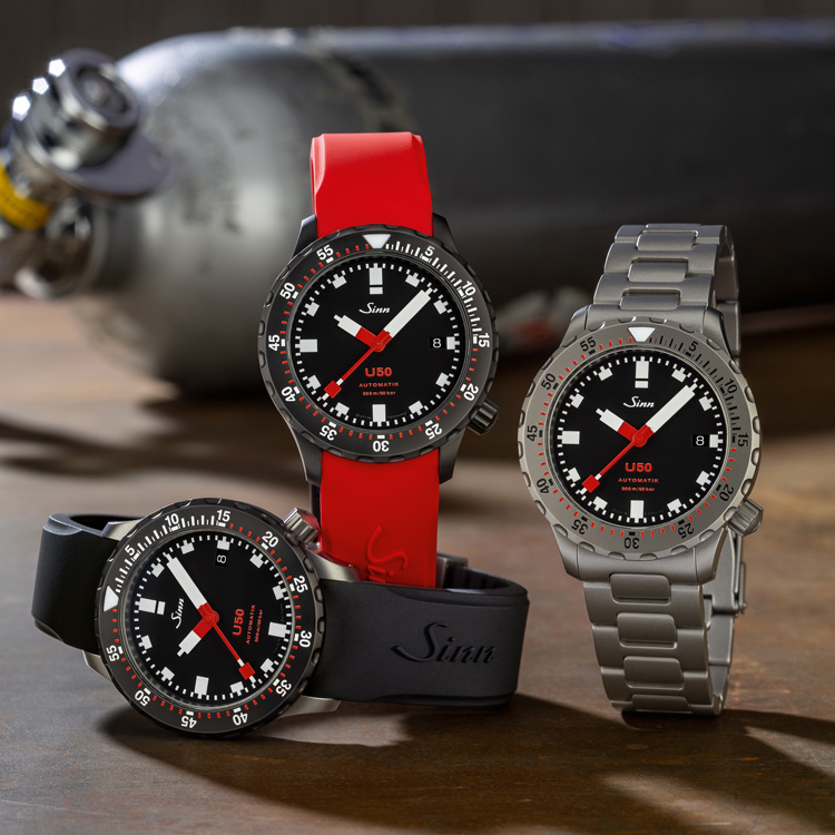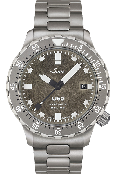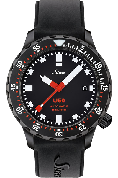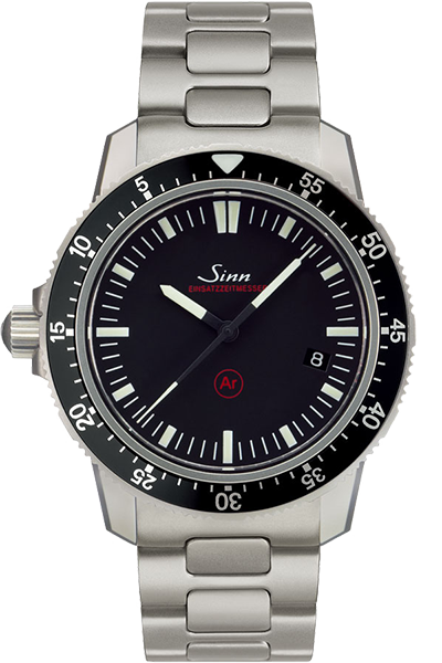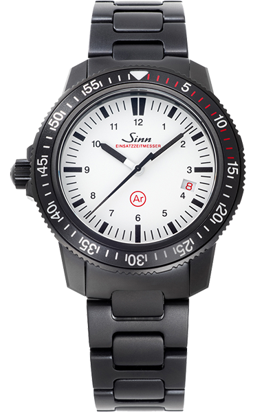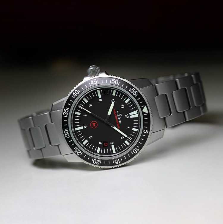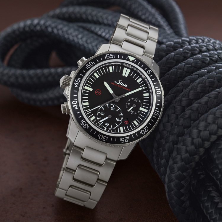 500m防水を誇る本格プロフェッショナルダイバーズ。左右非対称ケースによる高い装着性も魅力で、Sinnの技術力を象徴するモデルです。