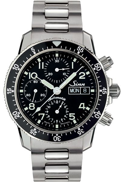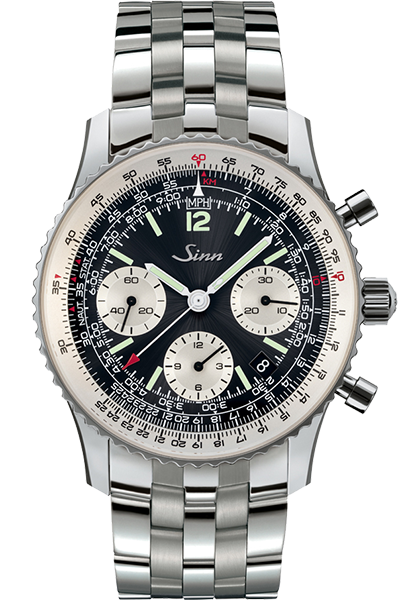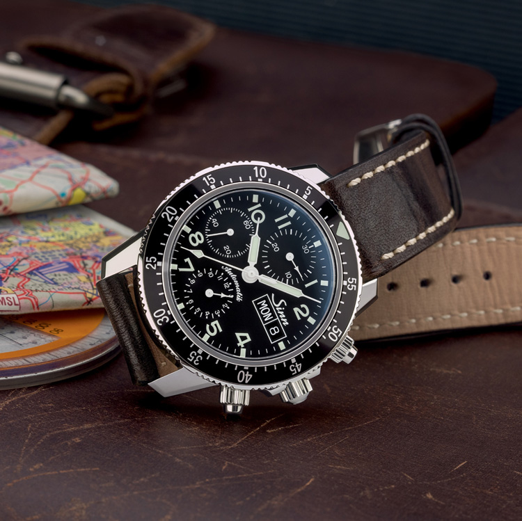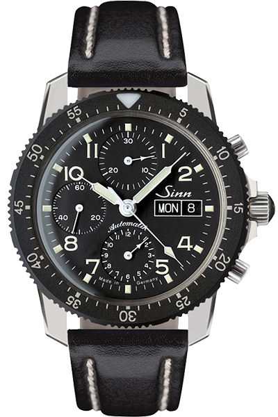 Sinnの真骨頂とも言えるパイロット・クロノグラフモデル。高性能ムーブメントと変わらないデザイン、視認性の高いダイヤルは、航空計器メーカーとしてのDNAを色濃く感じさせます。
